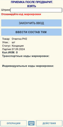 Форма ввода информации о кодах маркировки предусмотрена для работы с цифровой маркировкой товара и идентична для автоматизированных рабочих мест и ручного выполнения задач. При выполнении задач с терминалом сбора данных на экран выводится запрос на ввод кодов маркировки: