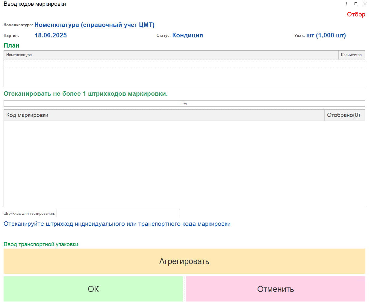 Форма ввода информации о кодах ЦМТ предусмотрена для работы с цифровой маркировкой товара и идентична для автоматизированных рабочих мест и ручного выполнения задач. При выполнении задач с терминалом сбора данных на экран выводится запрос на ввод кодов ЦМТ: