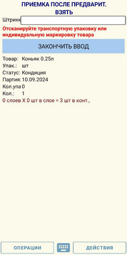 С применением терминалов сбора данных при обработке доверительной приемки производится сканирование штрих кодов с этикеток контейнеров. Товарный состав при этом по умолчанию соответствует плану, отраженному в Ожидаемой приемке. Если при приемке товара уже известно, по какому заказу от покупателя принимаемый товар будет отгружен, то возможно зарезервировать этот товар за этим заказом.