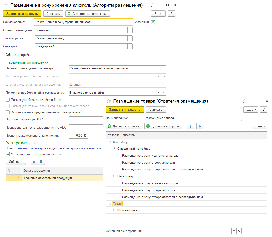 Размещение. В системе "1С:WMS Логистика. Управление складом" можно реализовать различные стратегии размещения товара: автоматическое, размещение через буфер, размещение ближе к зоне отбора; пополнение зоны отбора при размещении. Стратегии размещения включают в себя предопределенные условия Контейнер и Товар, которые определяют дальнейшее задание условий для выбранного объекта.