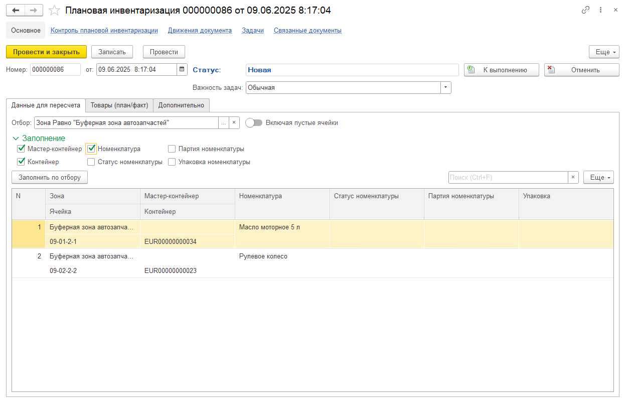 Для оформления инвентаризации предусмотрен документ Плановая инвентаризация. Документ Плановая инвентаризация служит для формирования на его основании плановых задач пересчета и контроля за их выполнением. Кроме того, документ содержит информацию о зонах и ячейках склада, мастер-контейнерах, контейнерах и номенклатуре, подлежащих пересчету. На основании данной информации формируются задачи пересчета.