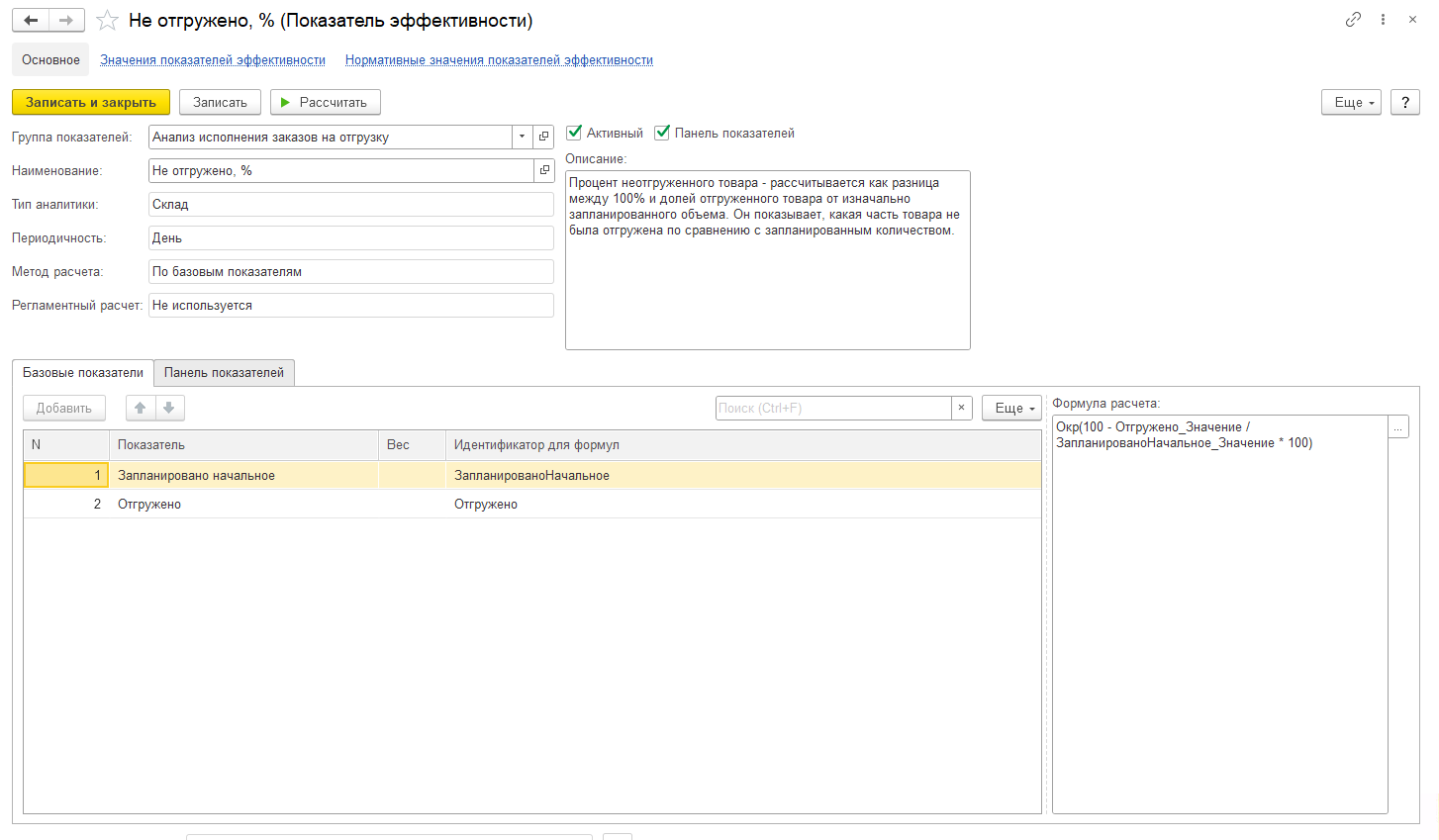 Для показателей может быть задана возможность вывода на Панели показателей эффективности, а также формат отображения.