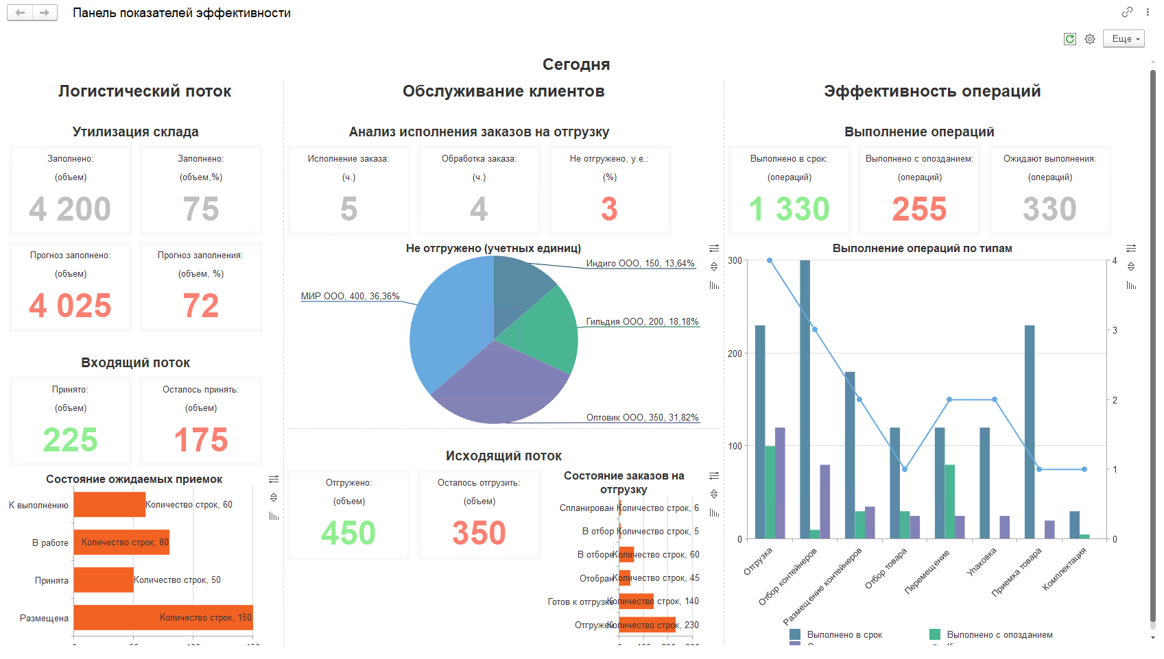 - Выводить ключевые показатели работы склада на Панель показателей эффективности в виде диаграмм и количественных данных.