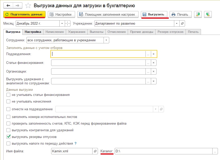 Гибкий отбор данных — выгрузка по всей организации, выбранным подразделениям и/или статьям финансирования;