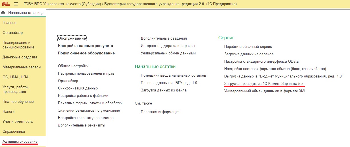 Загрузка проводок из «1С-КАМИН: Зарплата для бюджетных учреждений. Версия 5.5»