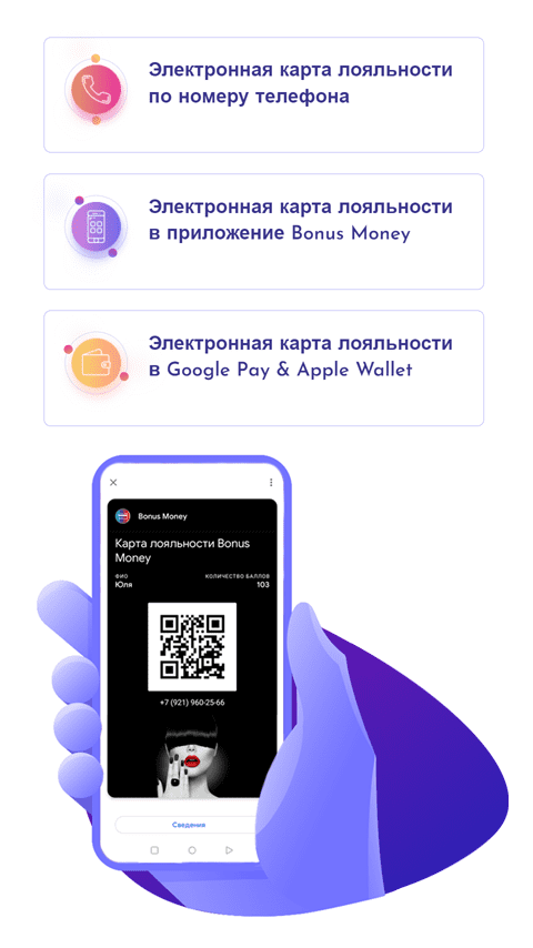 - электронную карту в Google Pay & Apple Wallet (полностью наша разработка, не нужно платить за сторонние сервисы для выпуска карт, а также кастомизацию электронной карты);