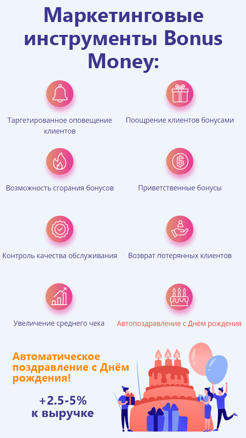 Bonus Money — это эффективная система лояльности, которая поможет Вам увеличить поток клиентов. При грамотном использовании сервиса Вы можете легко увеличить выручку на точке на 10-15%.