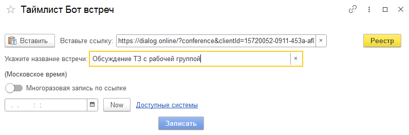 Бот записей встреч — это интеллектуальный помощник для автоматической записи онлайн-встреч, созданный для пользователей системы 1С. Он подключается к видеоконференции по ссылке (одноразовой или постоянной), автоматически отслеживает появление участников и включает запись. После завершения встречи бот отправляет видео на защищённый российский сервер, где его можно скачать в течение трёх дней.