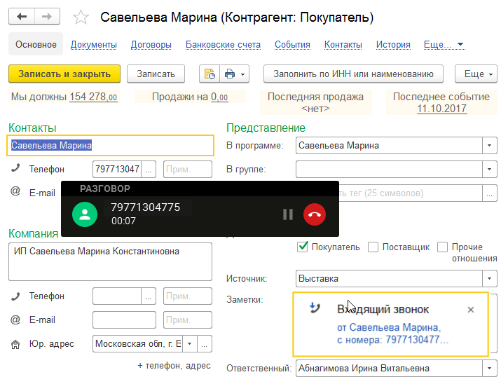 - во время звонка можно работать с договорами, коммерческими предложениями и заказами этого клиента;