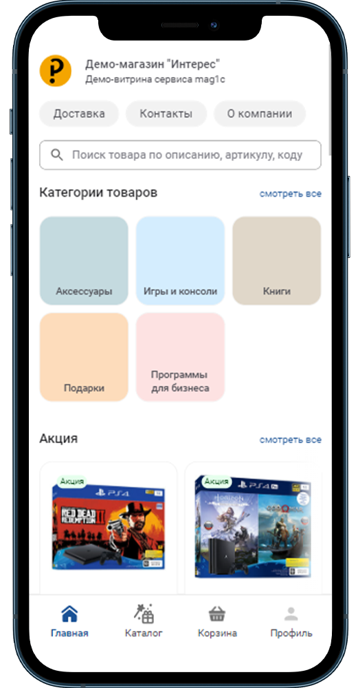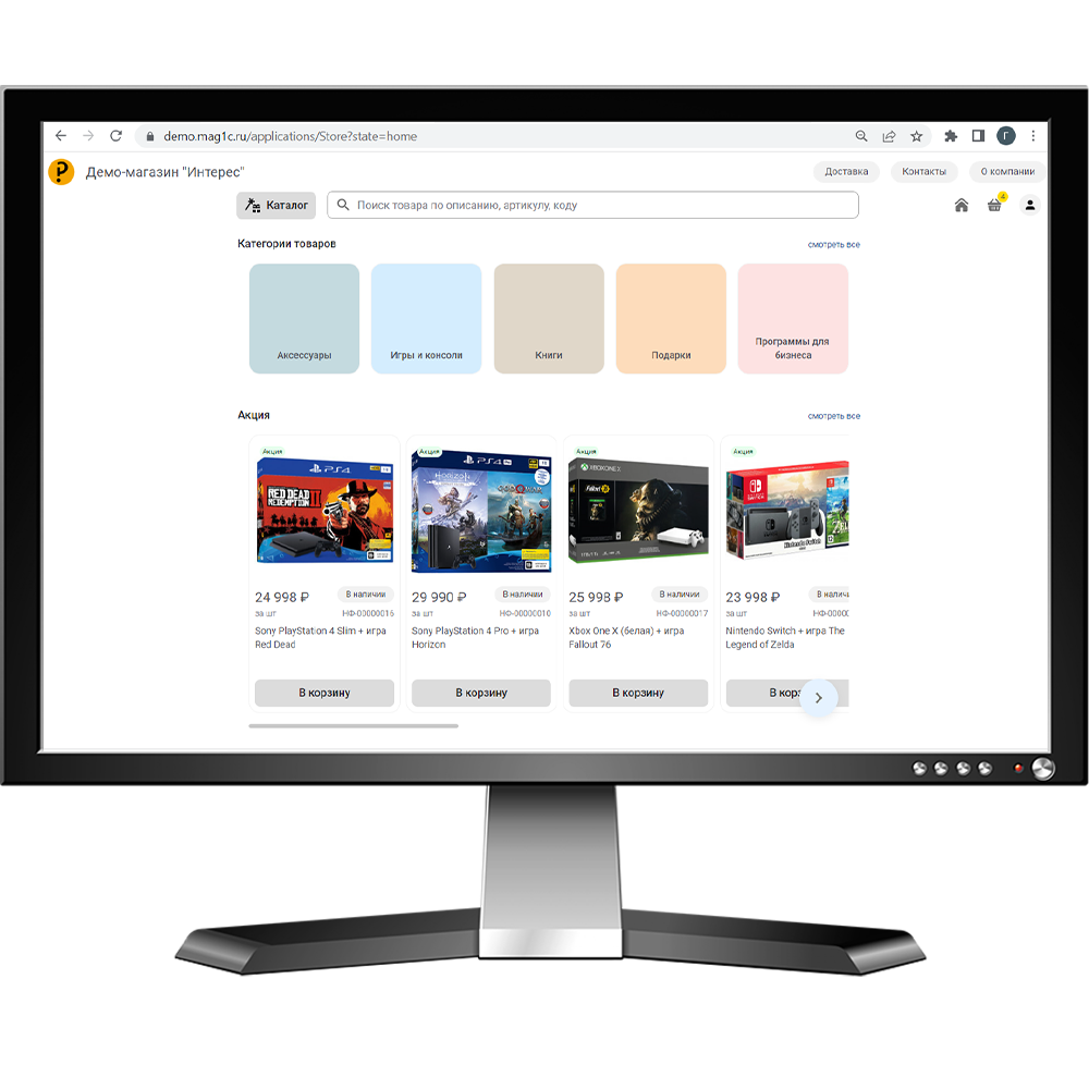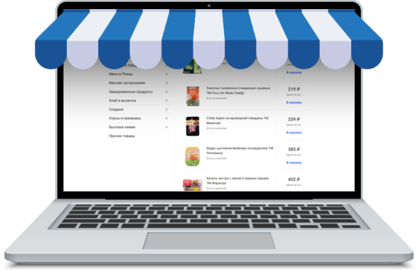 - На веб-витрину выгружаются товары из программы 1С, вы принимаете решение, какие товары выгружать.