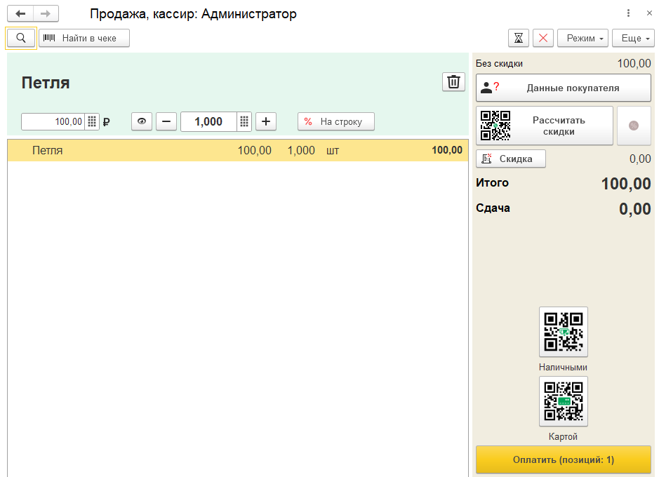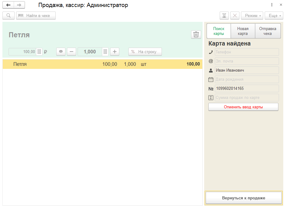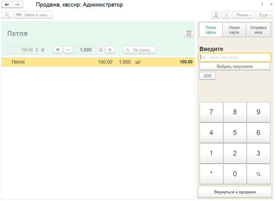 - Кассир работает с функционалом непосредственно из программного продукта 1С. Интерфейс программы знаком и понятен, что позволяет быстро начать работу с программой лояльности.