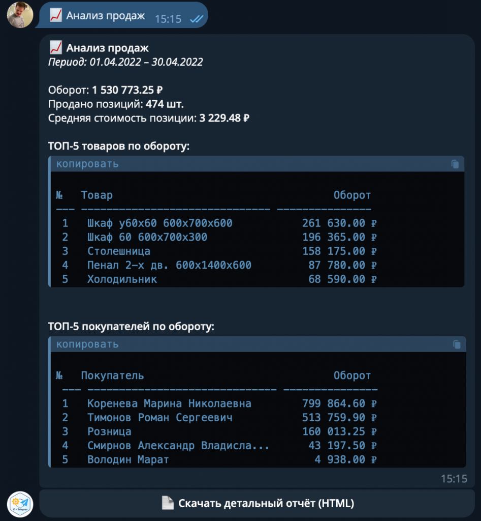 - Показывать продажи: обороты, средний чек, топ-товары, топ-клиенты;