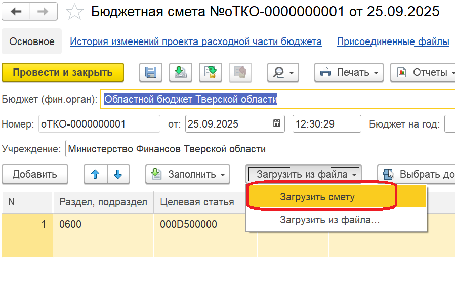 При использовании расширения в проектах расходной части бюджета при включенной печатной форме «Бюджетная смета» будет добавлена команда загрузки