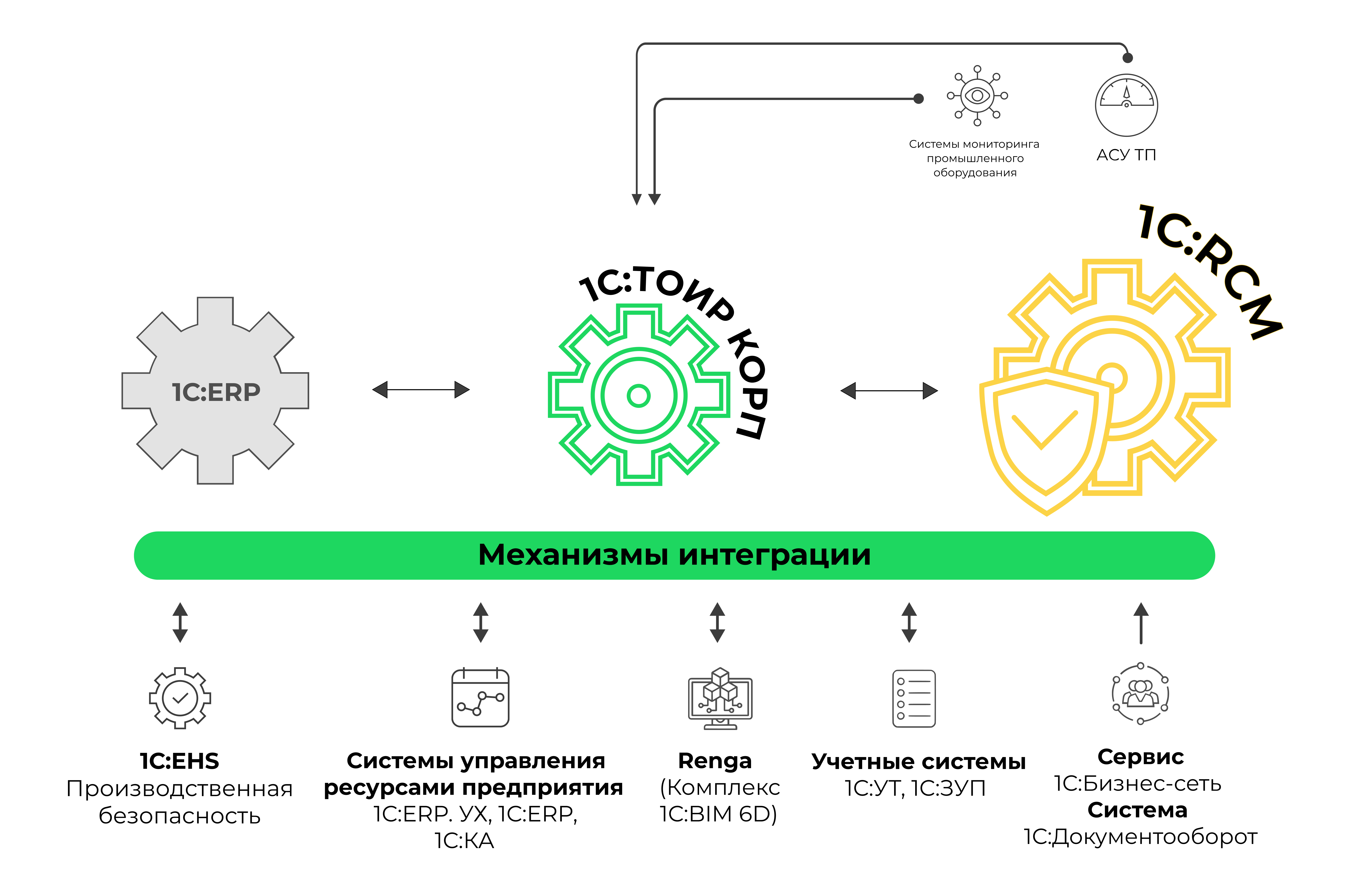 1С:RCM содержит встроенные механизмы обмена с "1С:ТОИР Управление ремонтами и обслуживанием оборудования КОРП", а также с решениями, содержащими конфигурации "ERP Управление предприятием" или "ERP. Управление холдингом", расширяя тем самым их возможности по управлению материальными активами.