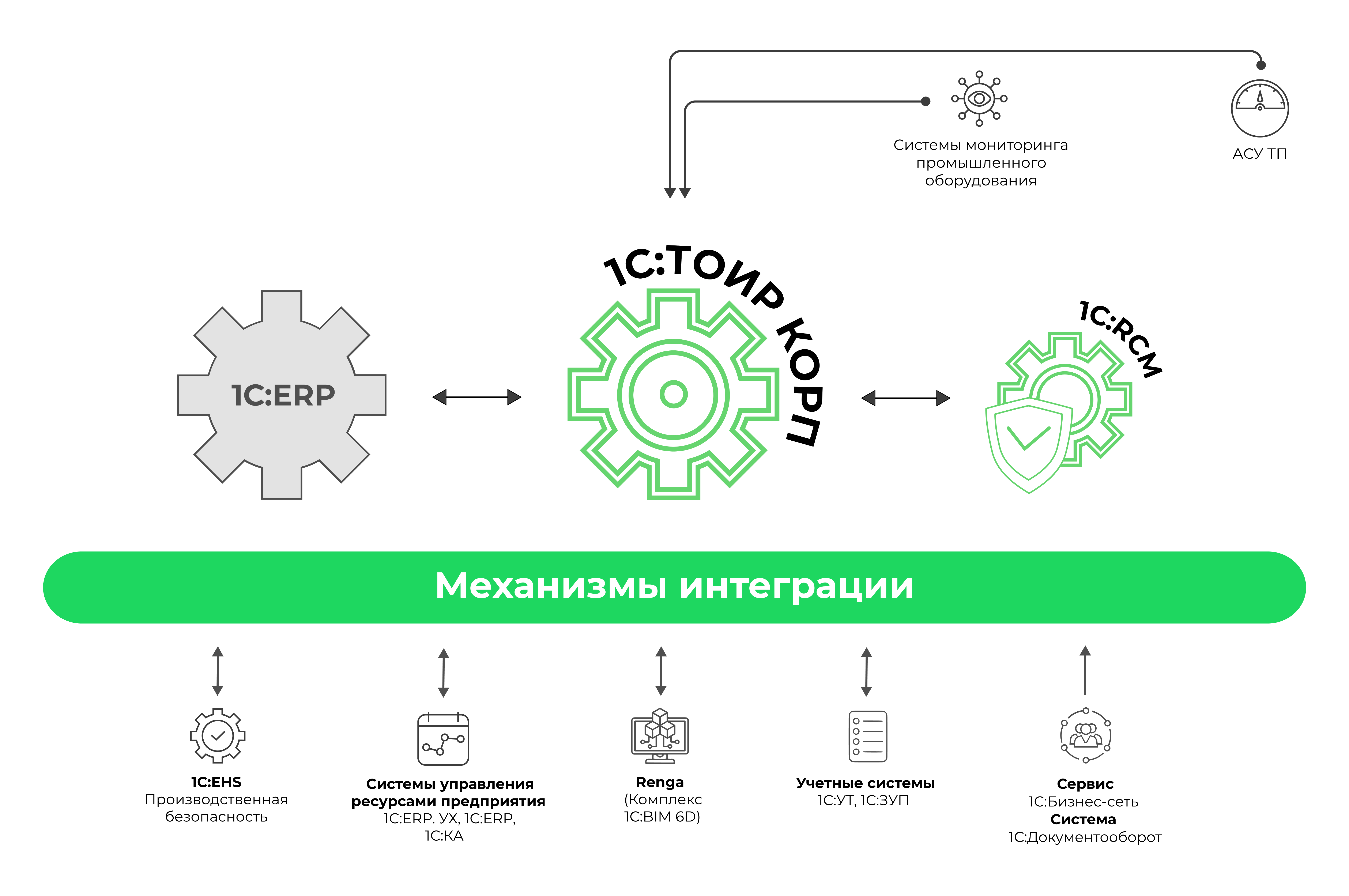 1С:ТОИР КОРП может использоваться как самостоятельно, так и совместно с решениями, содержащими конфигурации "ERP Управление предприятием" или "ERP. Управление холдингом", расширяя тем самым их возможности по управлению материальными активами. Совместное использование 1С:ТОИР КОРП и 1C:RCM Управление надежностью позволяет позволяет обеспечить заданный уровень надежности материальных активов предприятия при минимальных затратах на обслуживание.