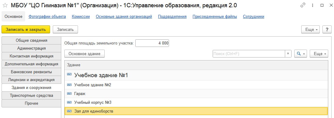 - Хранение информации об объектах имущества, стоящих на учете у образовательных организаций (здания, сооружения, транспортные средства, оборудование, программное обеспечение).