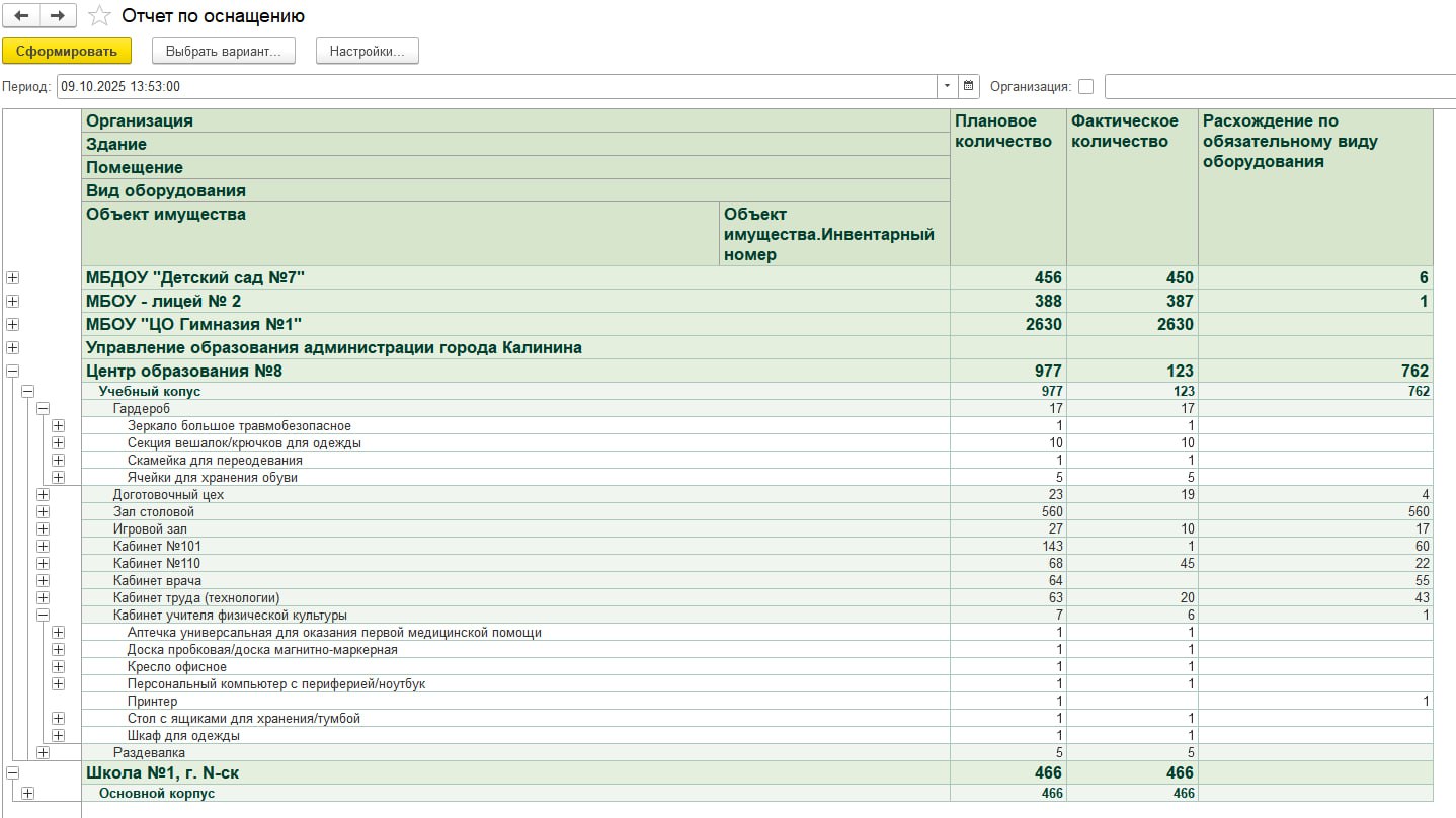 - Формирование отчетности: «Отчет по организации», «Отчет об активах», «Отчет по оснащению».