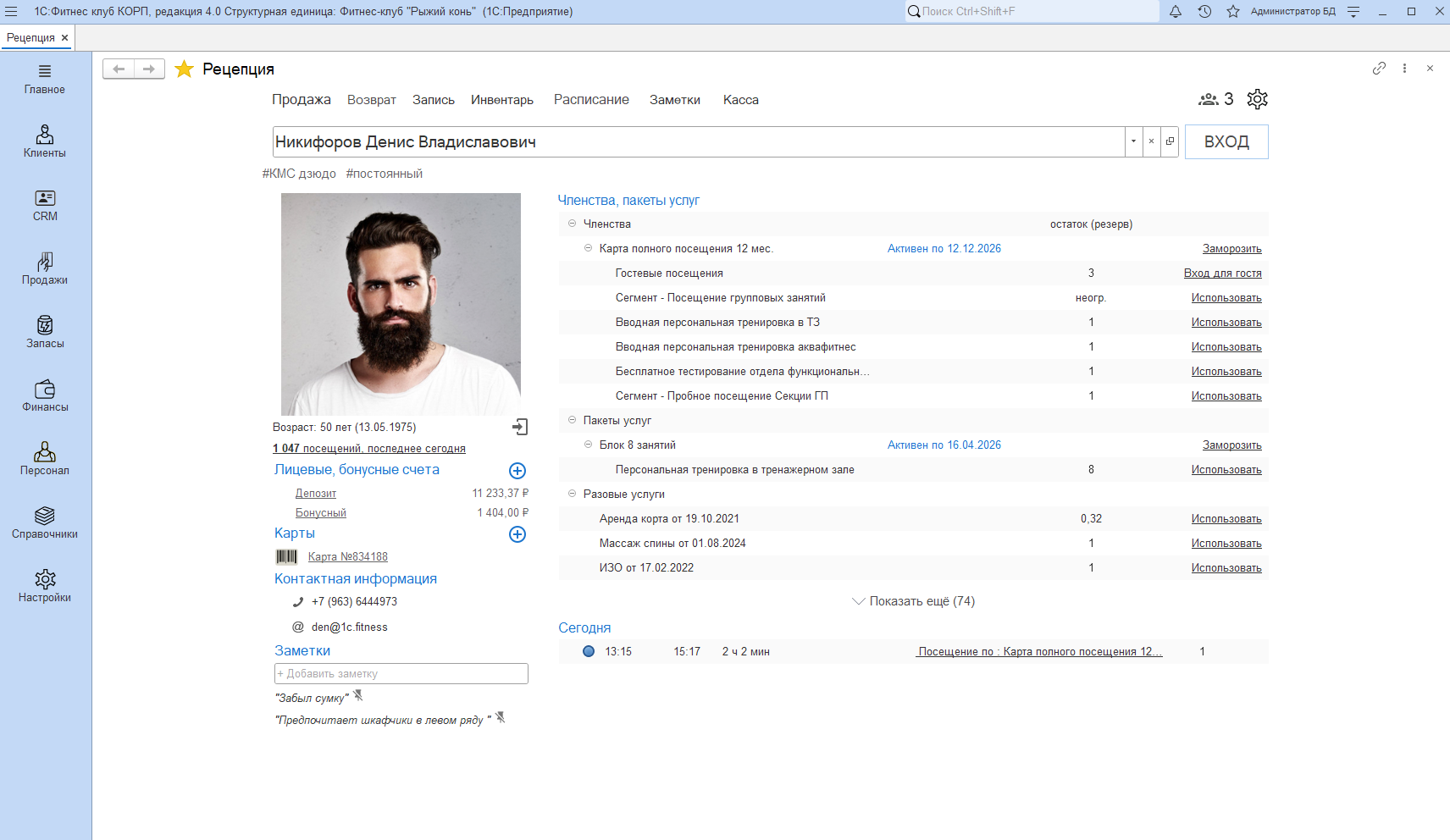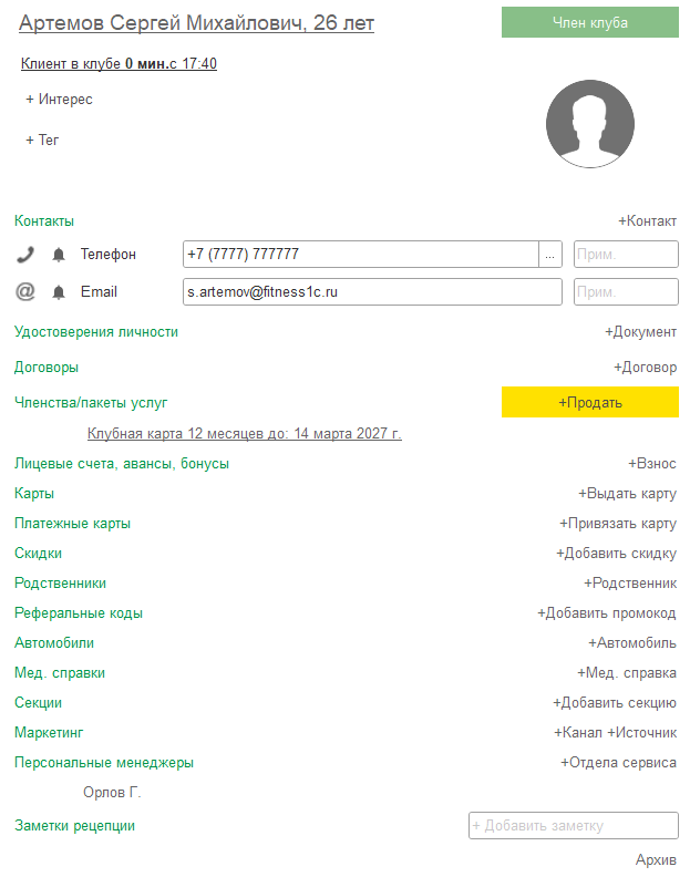 - Управление членствами и пакетами услуг (управление набором услуг при продаже членства и пакета услуг, продажа, активация, заморозка, продление и полная блокировка, передача другому клиенту, модификаторы членств и пакетов услуг).