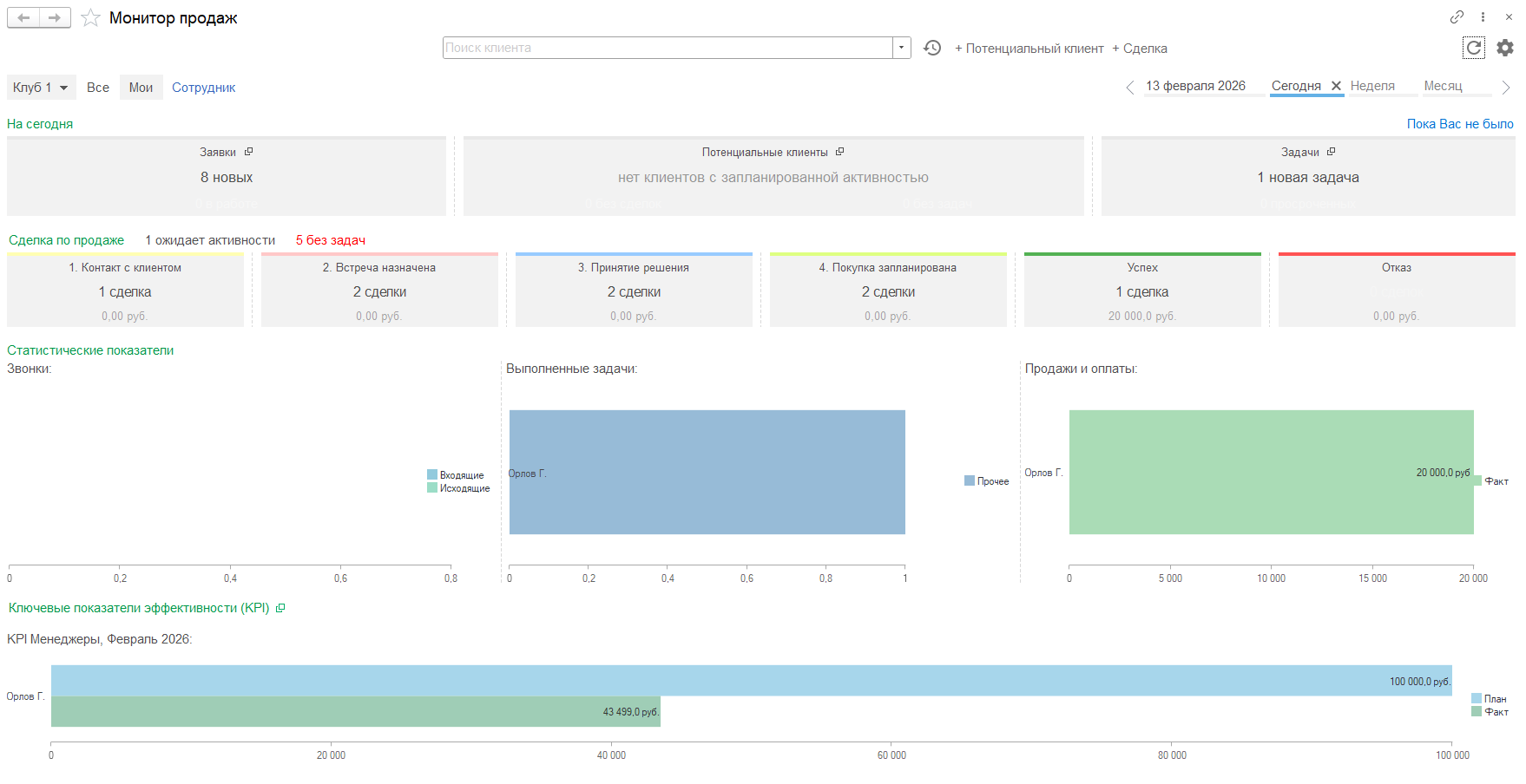 - Интерфейс "Руководитель отдела продаж": блок мониторинга задач менеджеров по работе с клиентами и контролем их исполнения, анализ загрузки клуба, воронка продаж.