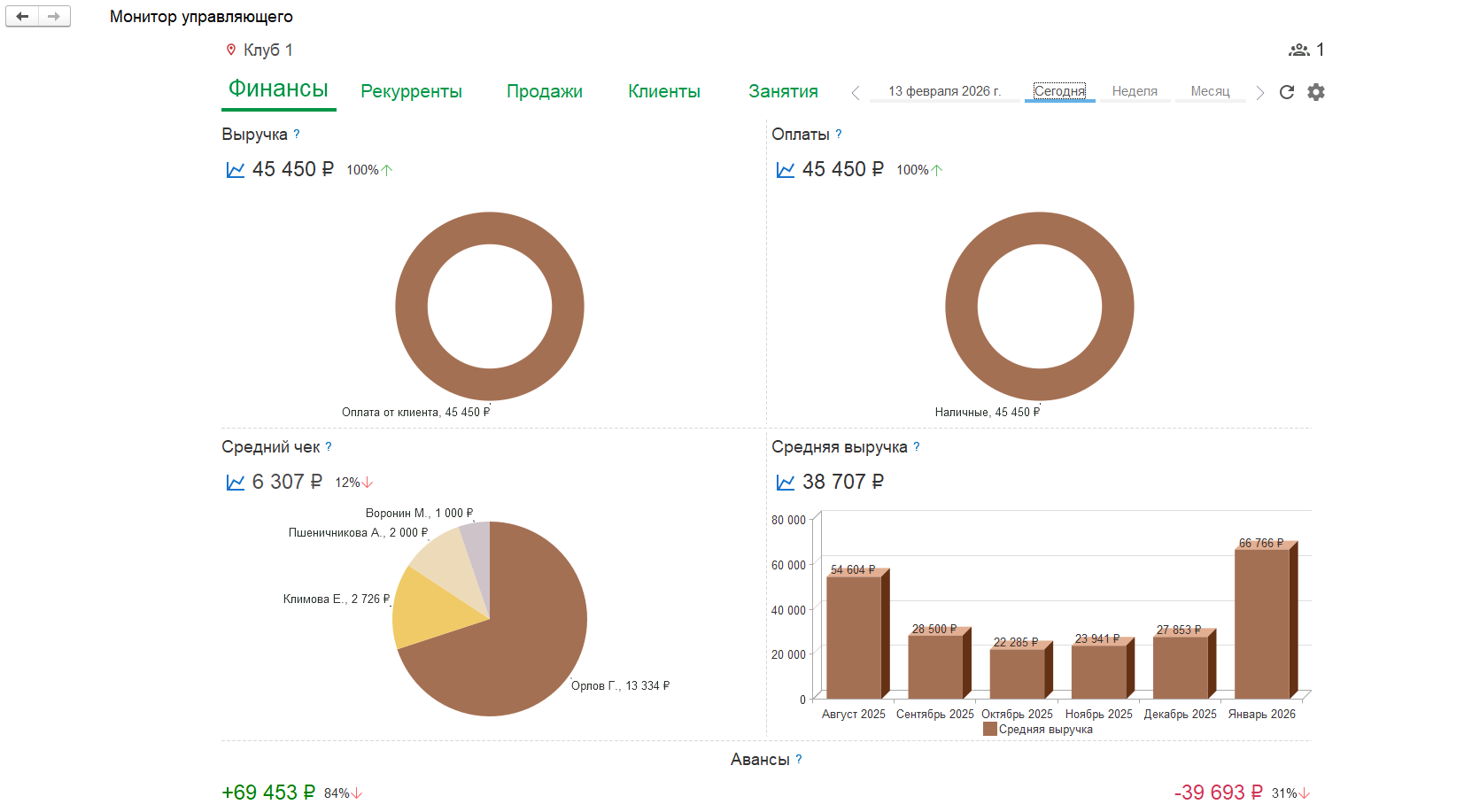 - Отчеты по клиентам (взаиморасчеты с клиентами, обязательства по членства и пакетам услуг, статистика посещений, посещаемость занятий и другие отчеты).