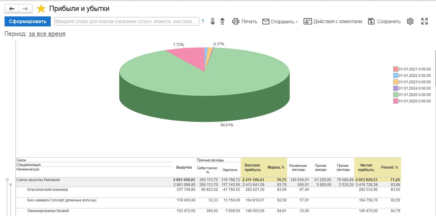 - Отчеты по клиентам (статистика посещения салона, загрузка рабочих мест салона, продажи по клиентам, рейтинг клиентов по отменам записи и многие другие).