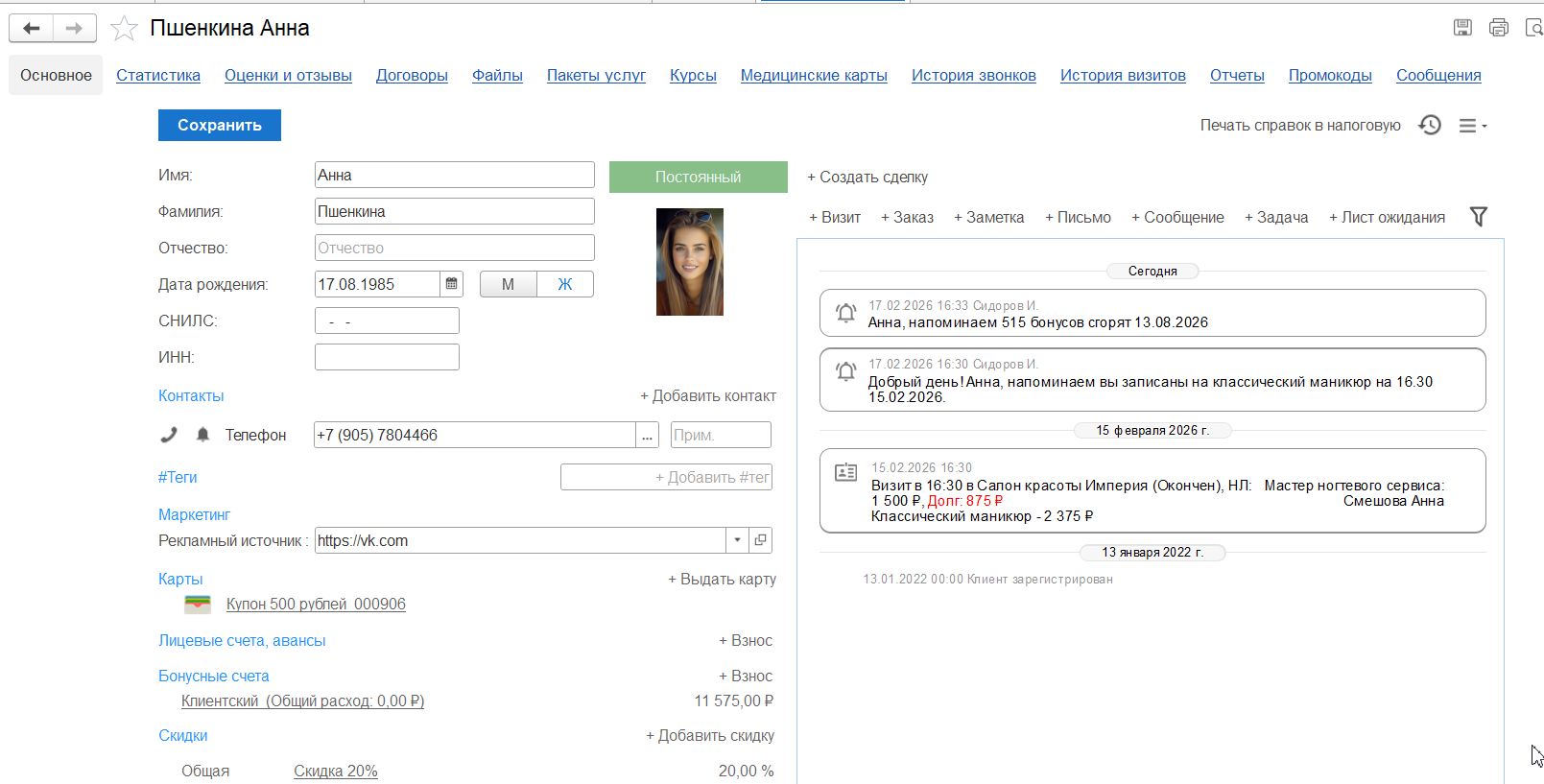 - Скидки и бонусные программы с различными условиями начислений, учитывающие день рождения, длительность визитов, количество оказанных услуг либо купленных товаров, наличие купленного пакета услуг, "каждая N-покупка", суммы покупок, внесение сумм на лицевой счет.