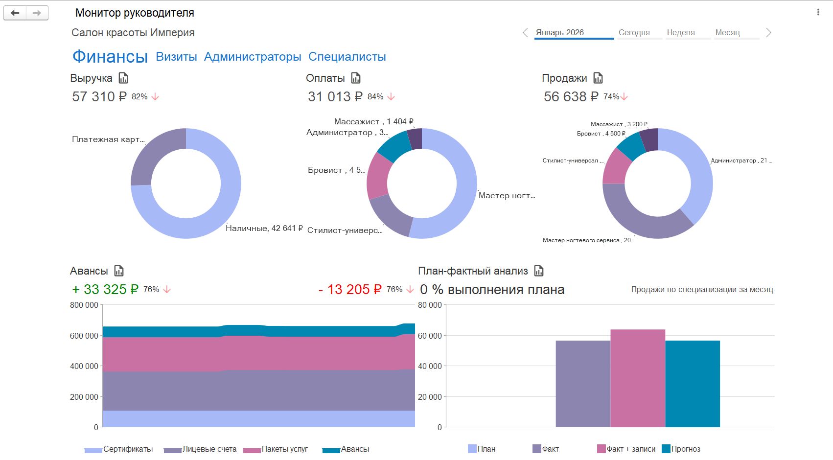 Детальная информация руководителю для оперативного управления салоном – структура записей, выручка, продажи, средний чек, количество новых записей, средняя заполненность салона, структура визитов по рекламным источникам, структура визитов по статусам, план-фактный анализ продаж.