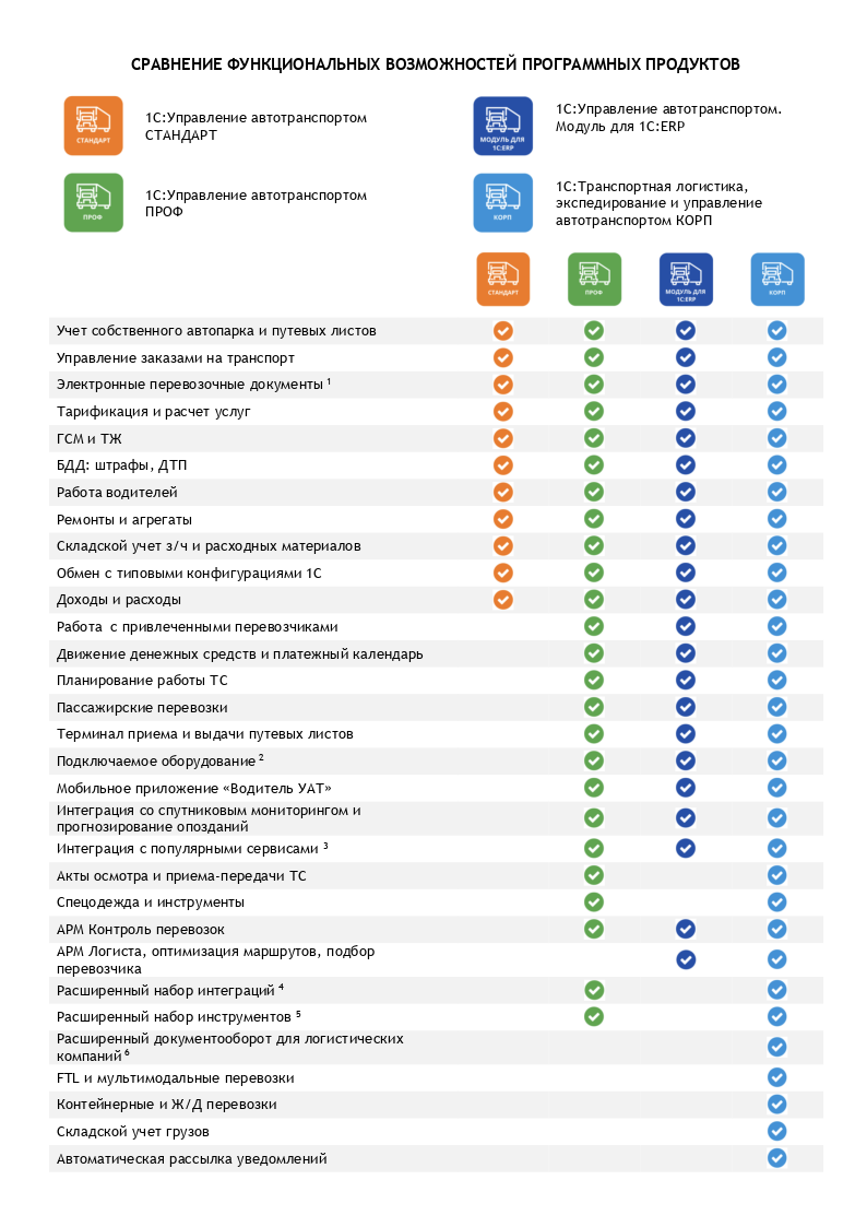 4.Телефония, интеграция с биржей грузоперевозок АТИ*, MultiGo, 1С:Аналитика, 1С:Распознавание первичных документов, 1С:Документооборот, 1С:WMS*, страхование грузов АО "СОГАЗ"*.