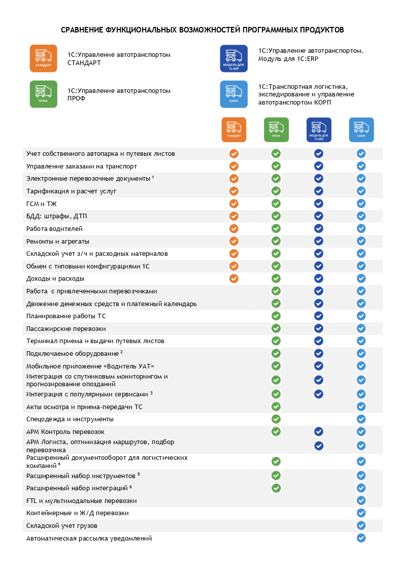 6. Телефония, интеграция с биржей грузоперевозок АТИ*, MultiGo, 1С:Аналитика, 1С:Распознавание первичных документов, 1С:Документооборот, 1С:WMS*, страхование грузов АО "СОГАЗ"*.