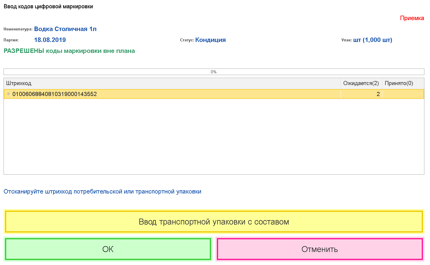 В случае отсутствия штрих кода на входящем товаре, можно выполнить его маркировку. Маркировку можно выполнить на любом этапе товародвижения. Для этого необходимо оформить документ "Маркировка", где будут сформированы штрих коды на товар и распечатаны этикетки.На этапе создания плана приемки – документа "Ожидаемая приемка" может быть известна информация о номерах контейнеров, ожидаемых к поступлению, и их товарном составе. Данная особенность характерна в основном для производственных складов. В этом случае приемка может выполняться в "доверительном" режиме ("Доверительная приемка"). Товарный состав подобных контейнеров, как правило, не пересчитывается при поступлении на склад, и приемка выполняется поконтейнерно.