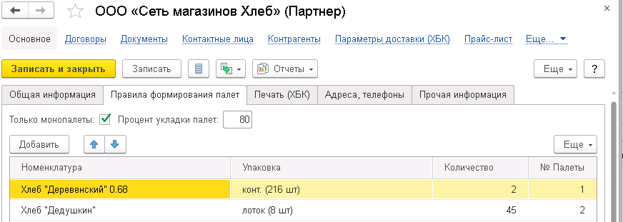 на основании укладки упаковки на паллете и указанного правила формирования паллет для клиентов;