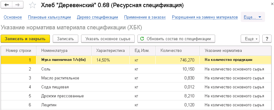 В справочнике "Ресурсные спецификации" добавлена форма, на которой определяется основное сырье и указываются нормативы материалов для расчета.