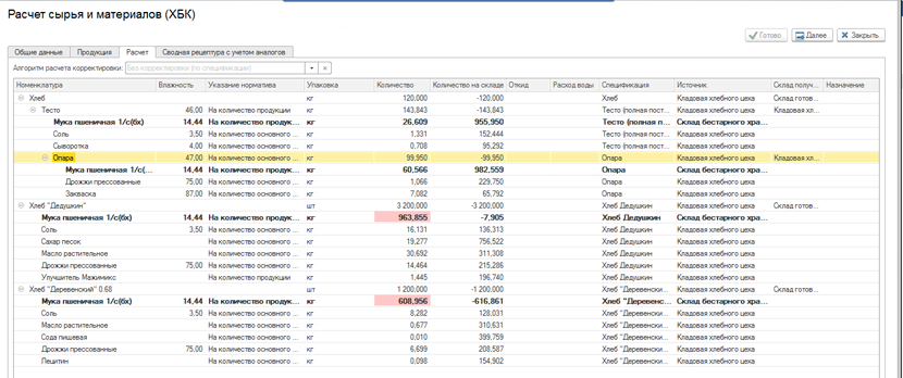 Реализован механизм расчета расхода сырья и материалов, необходимого для выпуска хлебобулочной и кондитерской продукции. Механизм учитывает фактическую влажность муки и предоставляет различные алгоритмы расчета расхода сырья и других параметров (расход воды, откиды); позволяет вводить в расчет технологические замены и аналоги сырья.