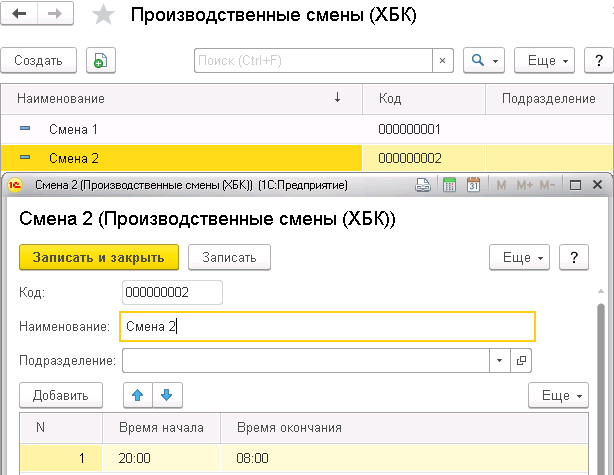 Предназначен для хранения графика работы смен предприятия с возможностью уточнения до подразделения. Используется для организации производственного процесса в документах "Открытие производственной смены (ХБК)" и "Закрытие производственной смены (ХБК)".