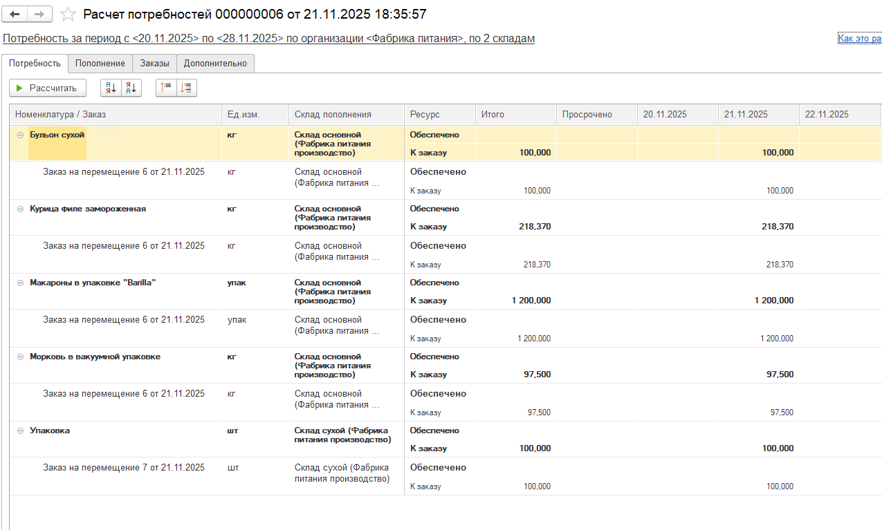 Блок обеспечения. В АРМ Расчета потребностей составляется график, где пользователь видит все позиции, которые должны быть закуплены или произведены к конкретной дате с учетом и без учета фактических остатков. При производстве по сменным заданиям потребности в ингредиентах по плану производства будут сразу сформированы непосредственно в цехах производства. При закупке материалов и ингредиентов можно выбрать поставщика, исходя из предложений по наилучшей цене. Есть возможность обеспечить потребности для заказов клиента с неуточненным складом, а также сформировать график потребностей по конкретному способу обеспечения, например, только по способу "производство продукции".
