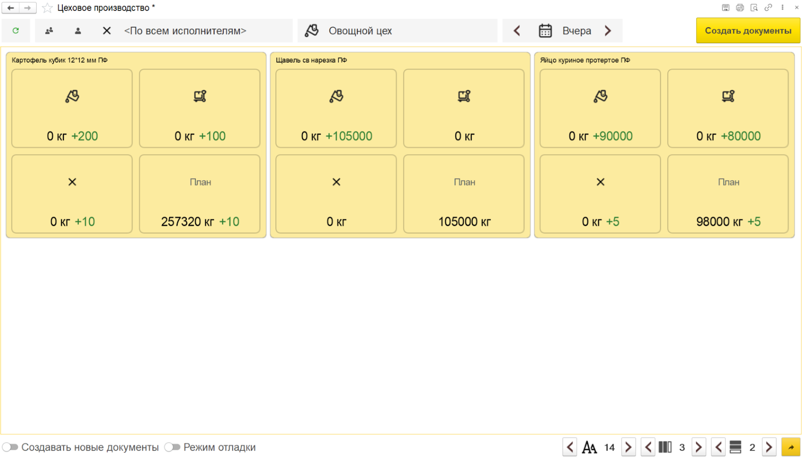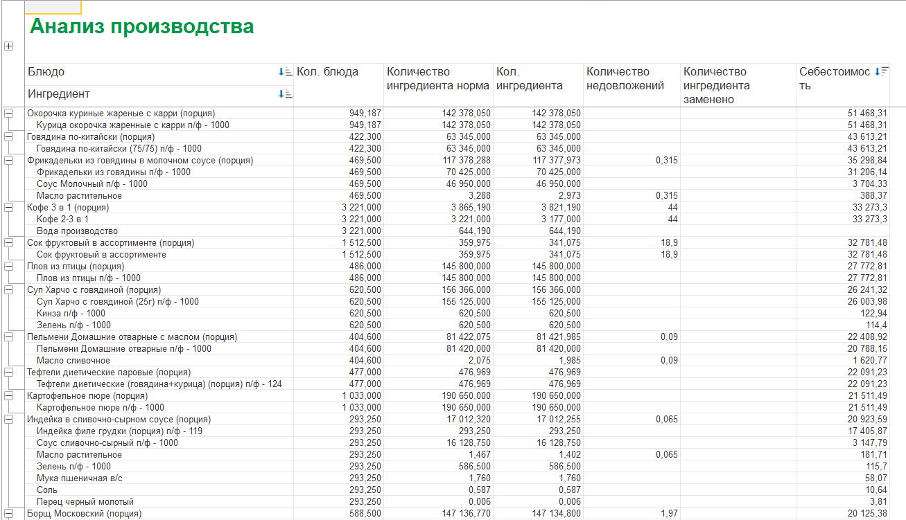 Учет производства полуфабрикатов, готовой продукции или блюд, а также количества и сумм списанных в производство ингредиентов, согласно заведенным ранее рецептурам, с возможностью оценки потребностей ингредиентов и их обеспечения.