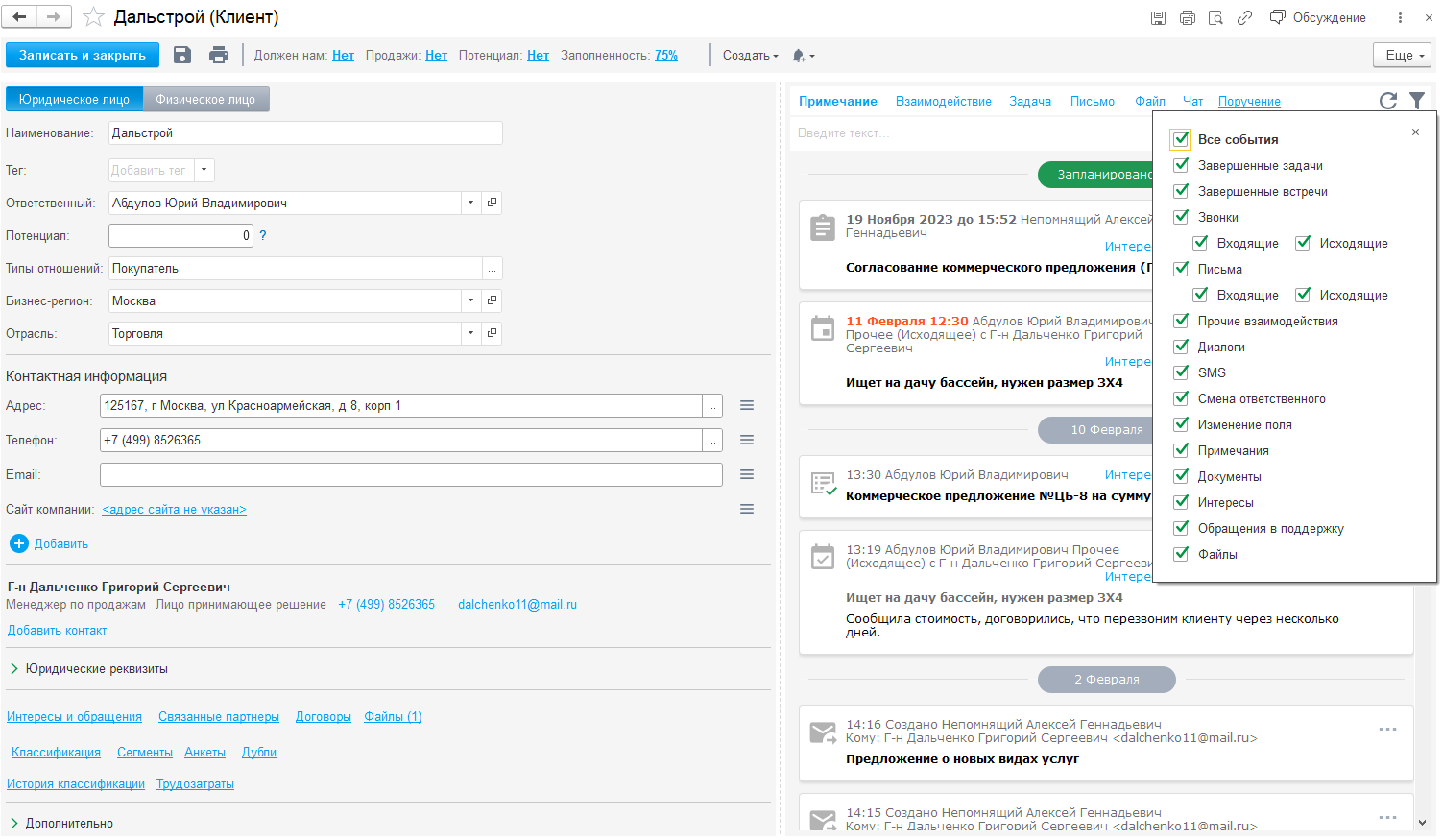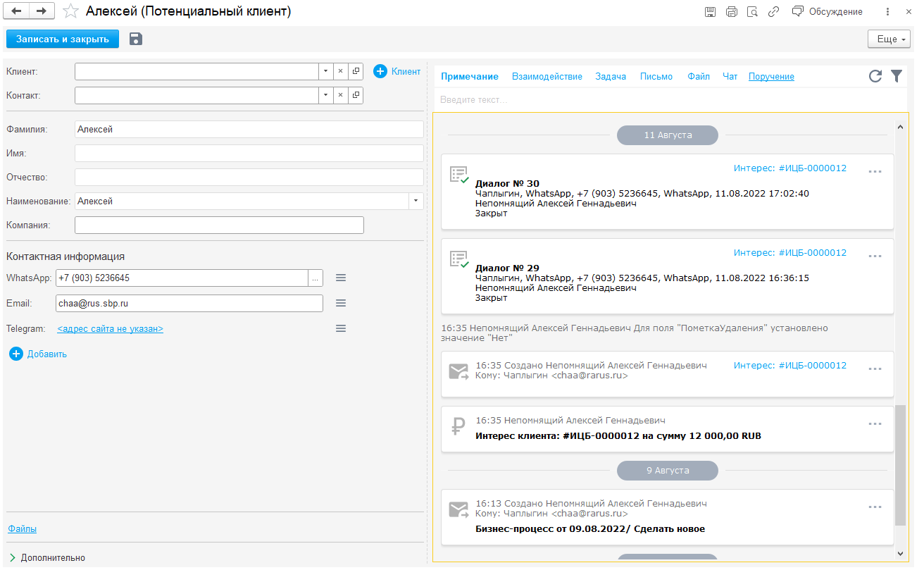 - Развита работа с потенциальными клиентами – все маркетинговые касания и обращения собираются в карточке потенциального клиента с возможностью переноса всей истории при создании клиента.