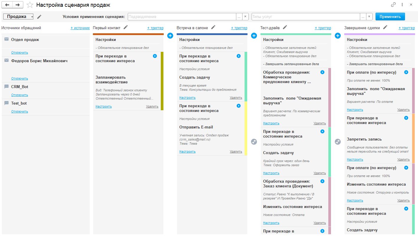 Роботы для автоматизации (триггеры) рутинных задач, движения по сделкам, согласования договоров, передачи оплаты счетов и контроля за зависанием сделок. Состоят из условия и совершаемого действия. Поставляемая в решении комбинация условий и действий позволяет подключить более 100 уникальных роботов для помощи менеджерам в продажах, а в случае отсутствия нужного – создать его.