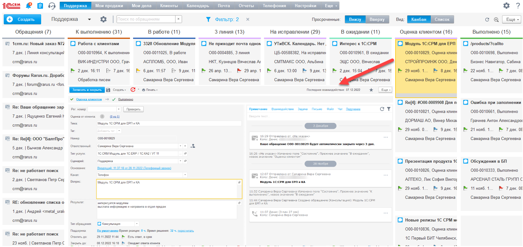 Поддержка – рабочее место для отработки обращений не связанных с продажами согласно уровням поддержки. Позволяет организовать процессы сервисного обслуживания клиентов и разгрузить отработку нецелевых обращений подразделениями продаж. Включает: цветовую индикацию сроков регистрации нарушения сроков отработки обращений согласно уровням обслуживания, ведение тайминга по затраченному времени в разрезе каждого обращений и клиента.