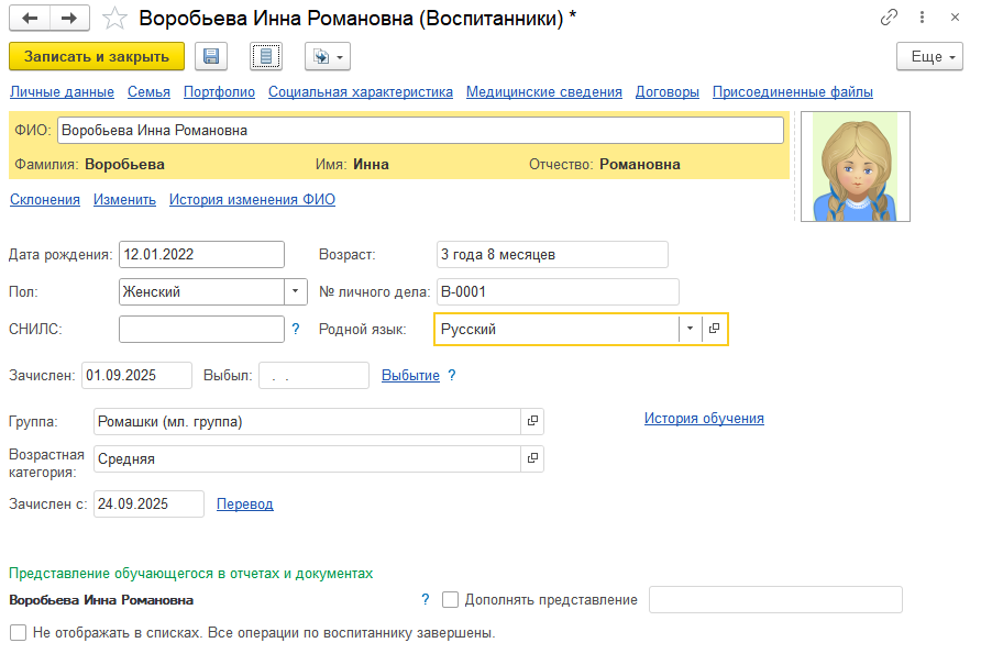 - учет личных дел воспитанников (в т.ч. хранение основных данных о детях, сведений о родителях/ законных представителях, социальным характеристикам, медицинским сведениям);