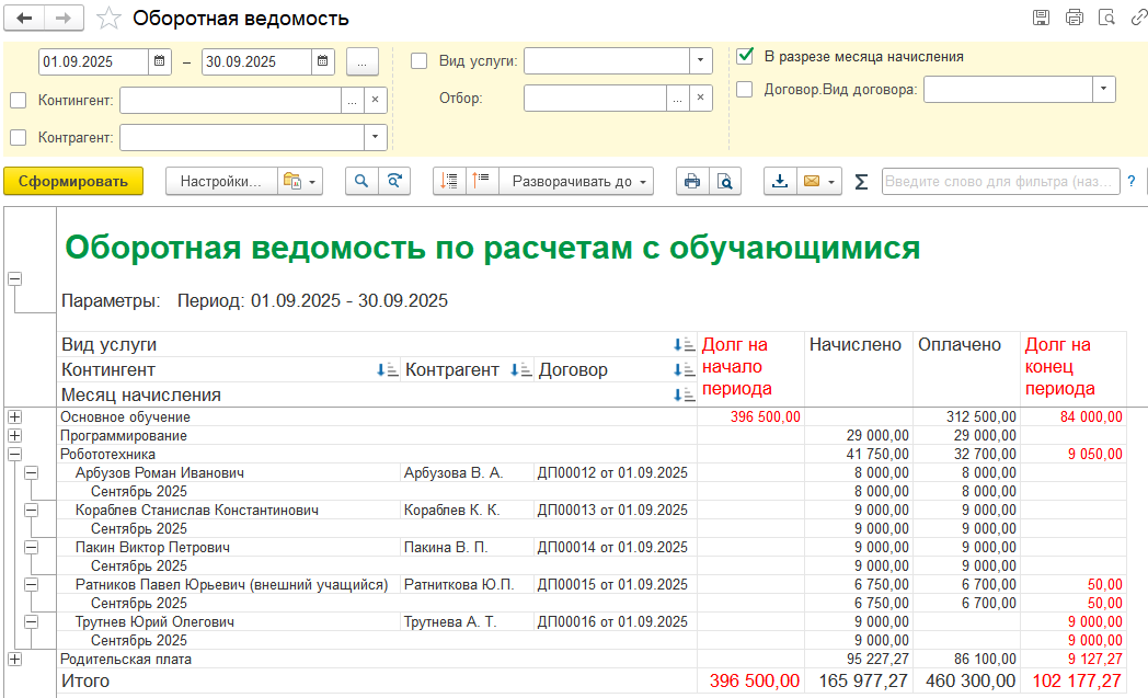4.3. оборотная ведомость по взаиморасчетам с учащимися за выбранный период.