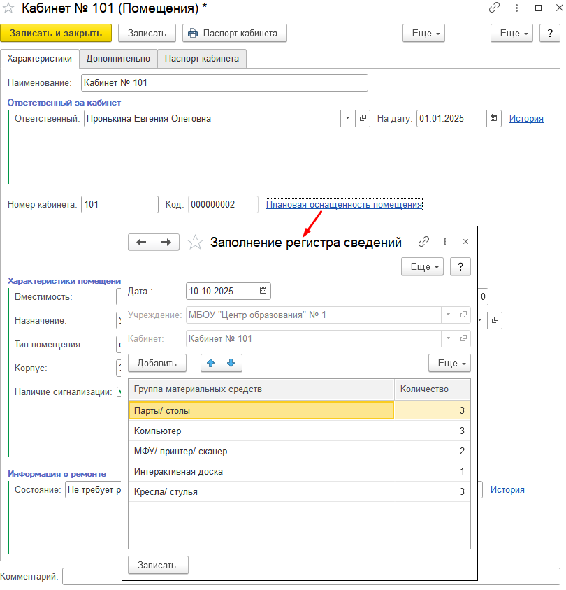 3. Ввод информации о материально-технических средствах (можно указать в карточке материального средства раздел паспорта кабинета, в который попадет это материальное средство.