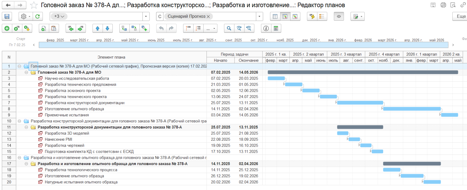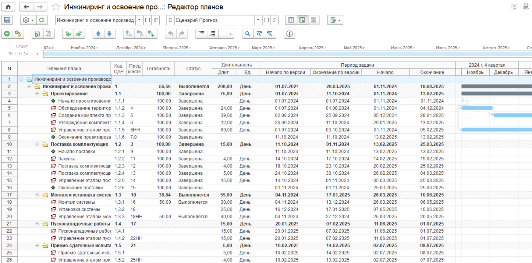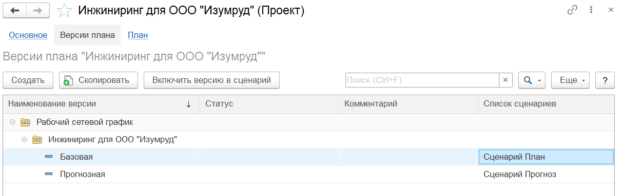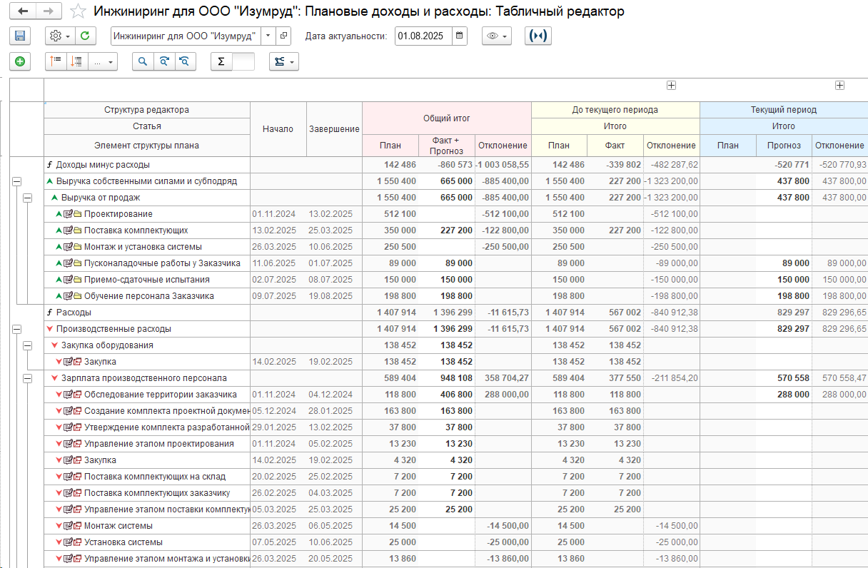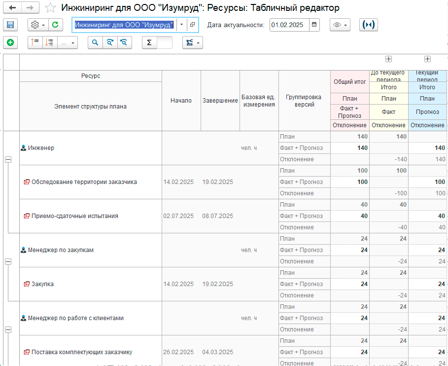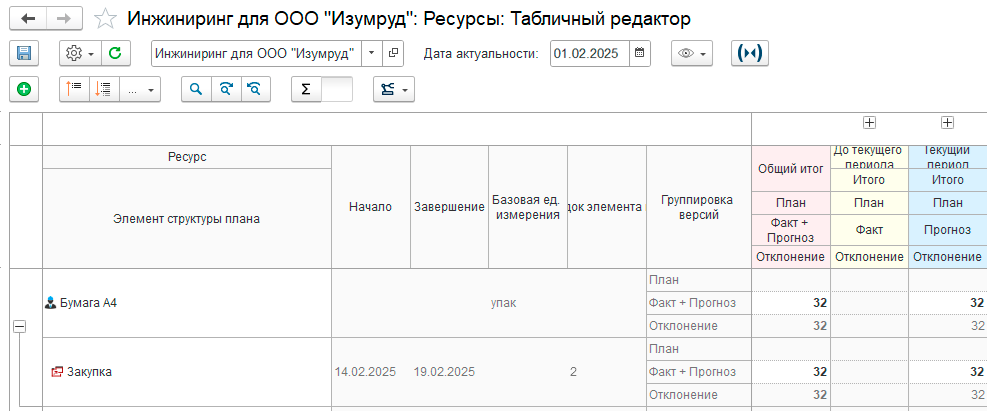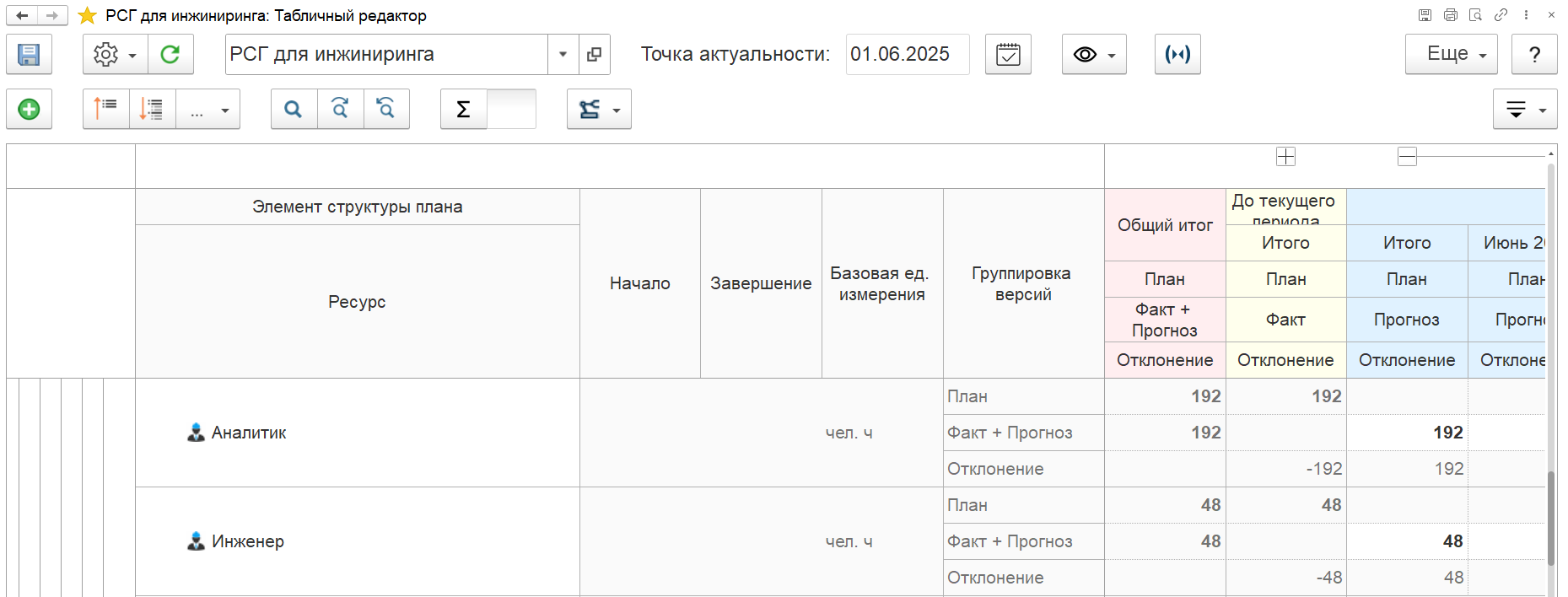 - редактирование в табличном редакторе ресурсов и результатов по сценариям "План" и "Факт плюс Прогноз";