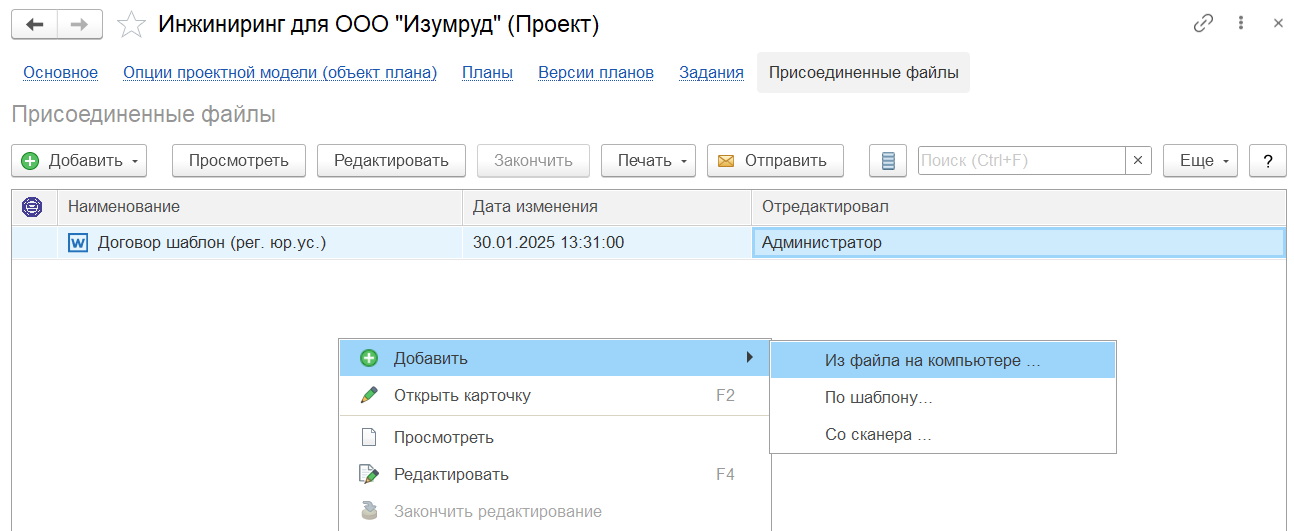 - Интеграция с "1С:Документооборот": регистрация документов, запуск бизнес–процессов с возможностью присоединять внутренние документы к проектам, задачам и документам факта;