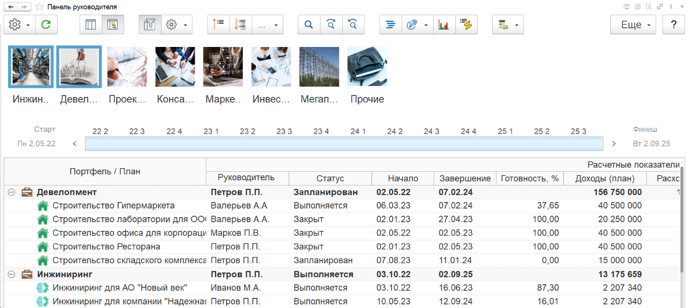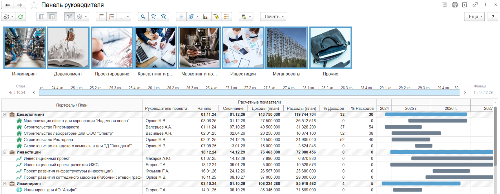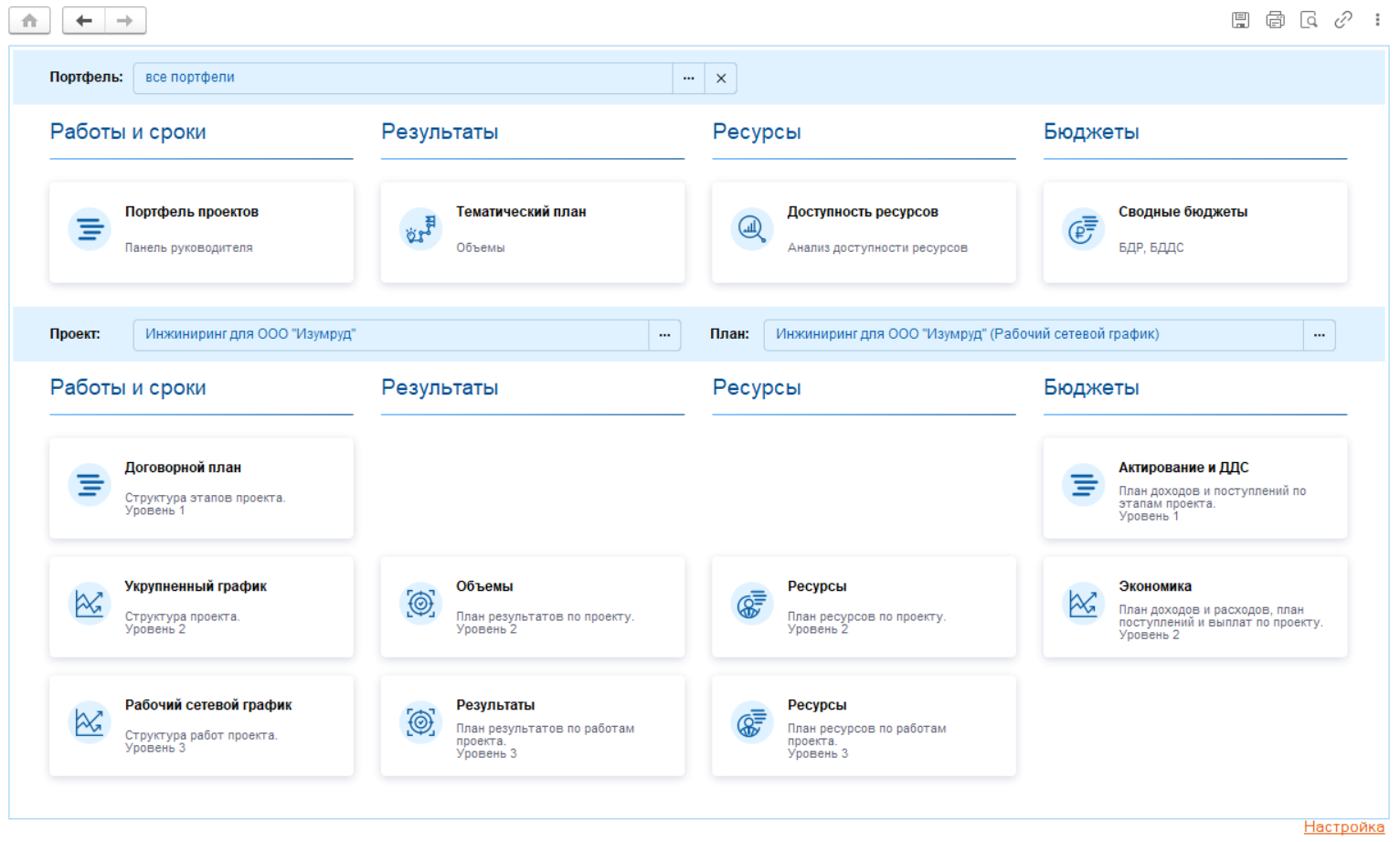 Система позволяет объединять проекты в программы и портфели. В одном портфеле и/или одной программе могут находиться проекты на разных стадиях жизненного цикла. Портфель проектов и программа проектов представляют собой дополнительные аналитические разрезы для всех отчетов и аналитических инструментов системы, в которых в том или ином качестве фигурируют проекты.