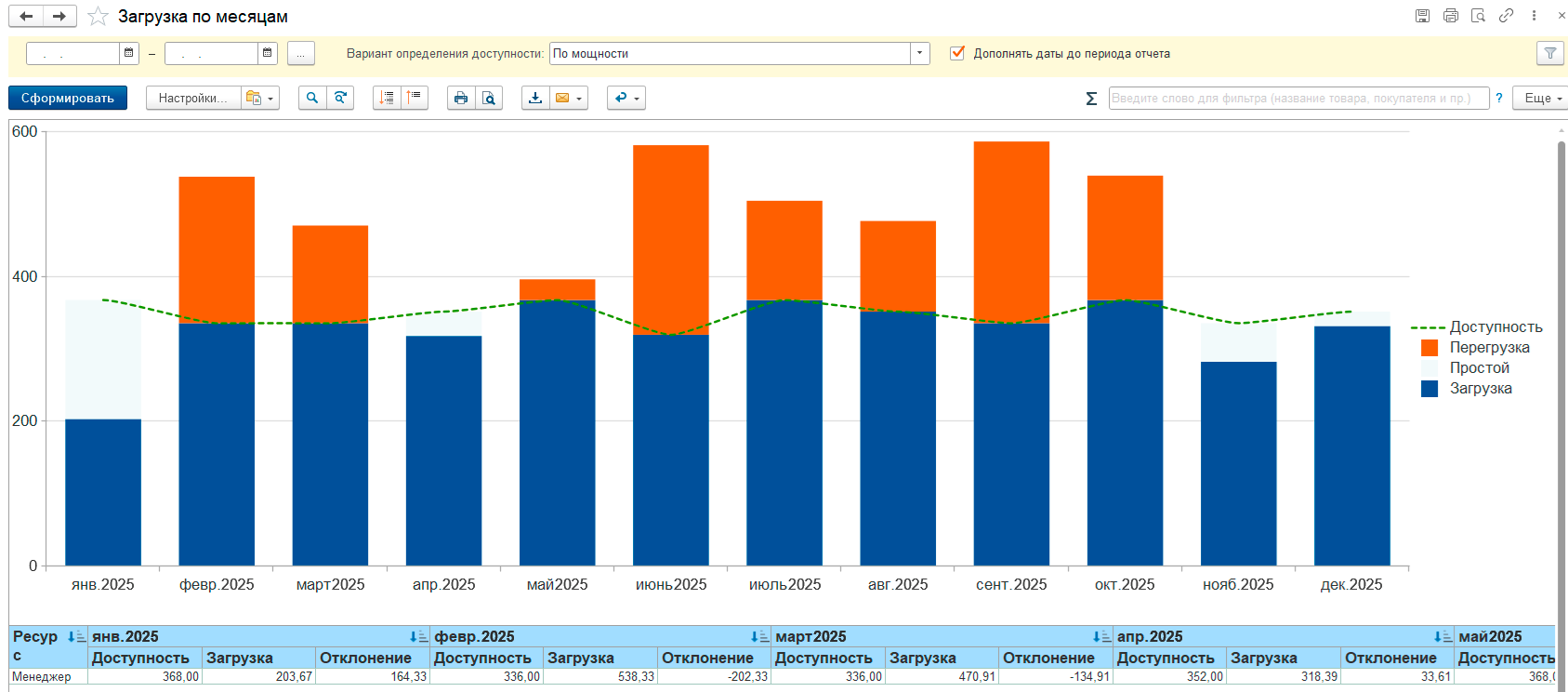 Для анализа загрузки и выполнимости группы проектов в системе предусмотрен отчет "Анализ загрузки ресурсов". Отчет позволяет произвести анализ перегрузки и простоя ресурсов назначенных на выполнение утверждённых, выполняемых и планируемых проектов исходя из доступной мощности ресурсов предприятия.