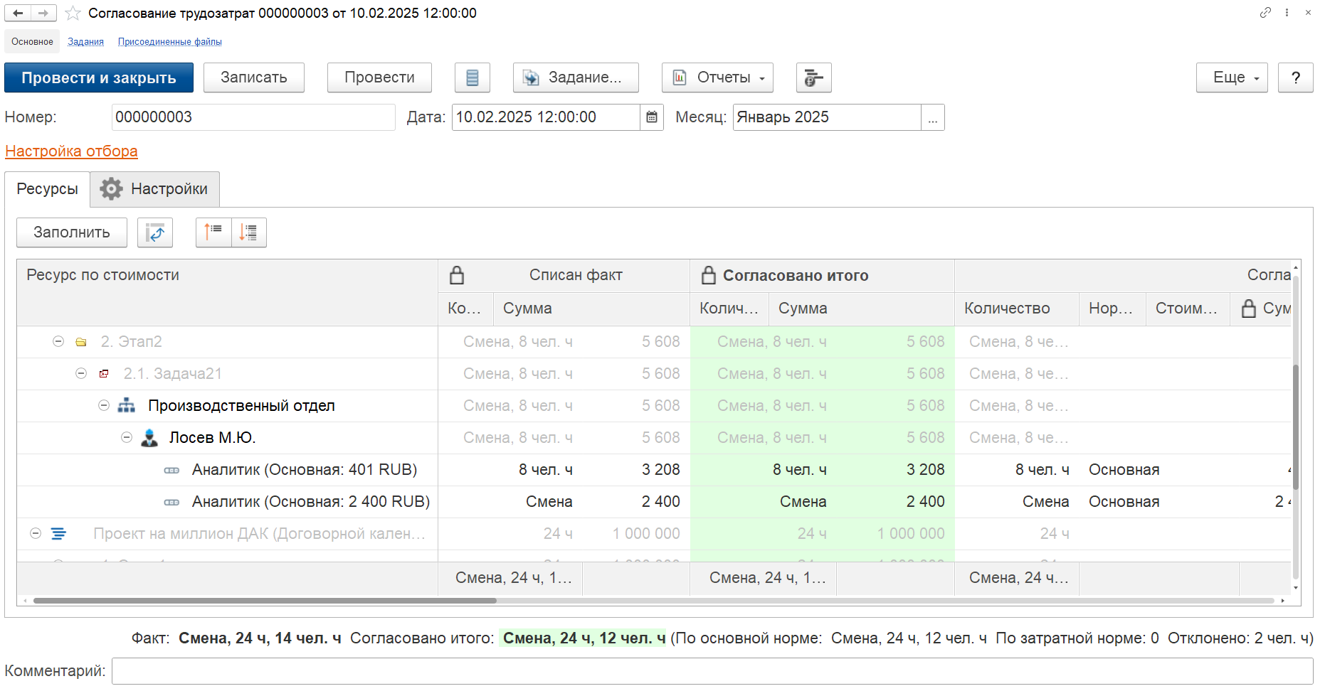 После того как в системе заполнены табели и введены отчеты о распределении фактического времени по проектам, у руководителя проектной задачи есть возможность скорректировать трудозатраты, отклонить какие-то часы и оценить их по норме стоимости для несогласованных затрат, а также отправить документ на дальнейшее согласование руководителю проекта и другим лицам, принимающим решения.