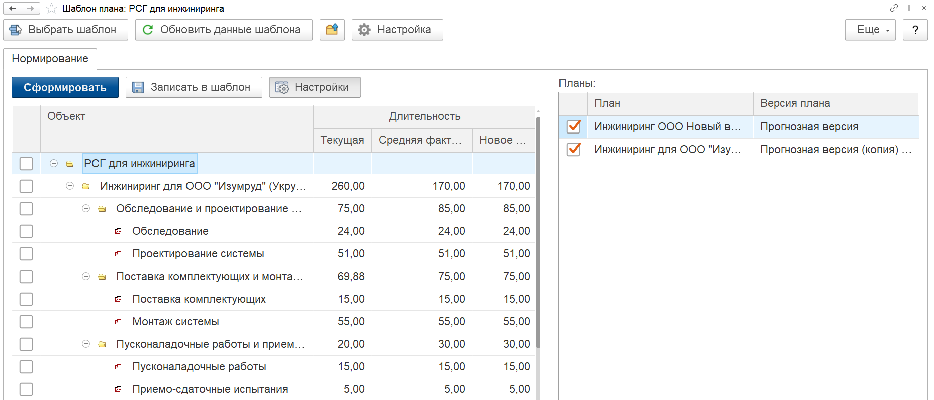 Система позволяет на основании статистической информации о фактической длительности выполнения работ обновить плановую длительность работ в шаблоне проекта.