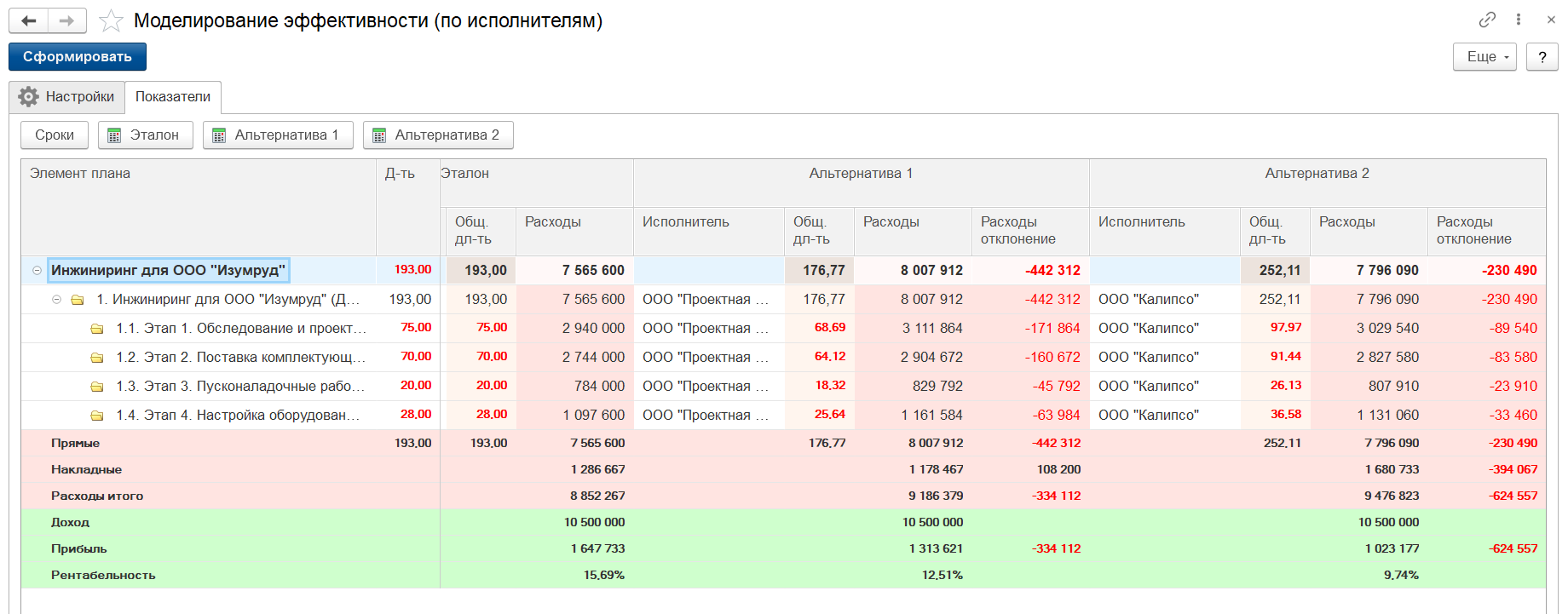 Функциональность "Моделирование эффективности проекта" предназначена для моделирования и сравнения нескольких вариантов "что если" на стадии планирования проекта и позволяет оценить изменение критического пути, сроков, стоимости работ и рентабельности проекта в зависимости от компетенций разных подрядчиков, смоделировать и сравнить несколько альтернативных вариантов, выбрать наилучший из возможных.