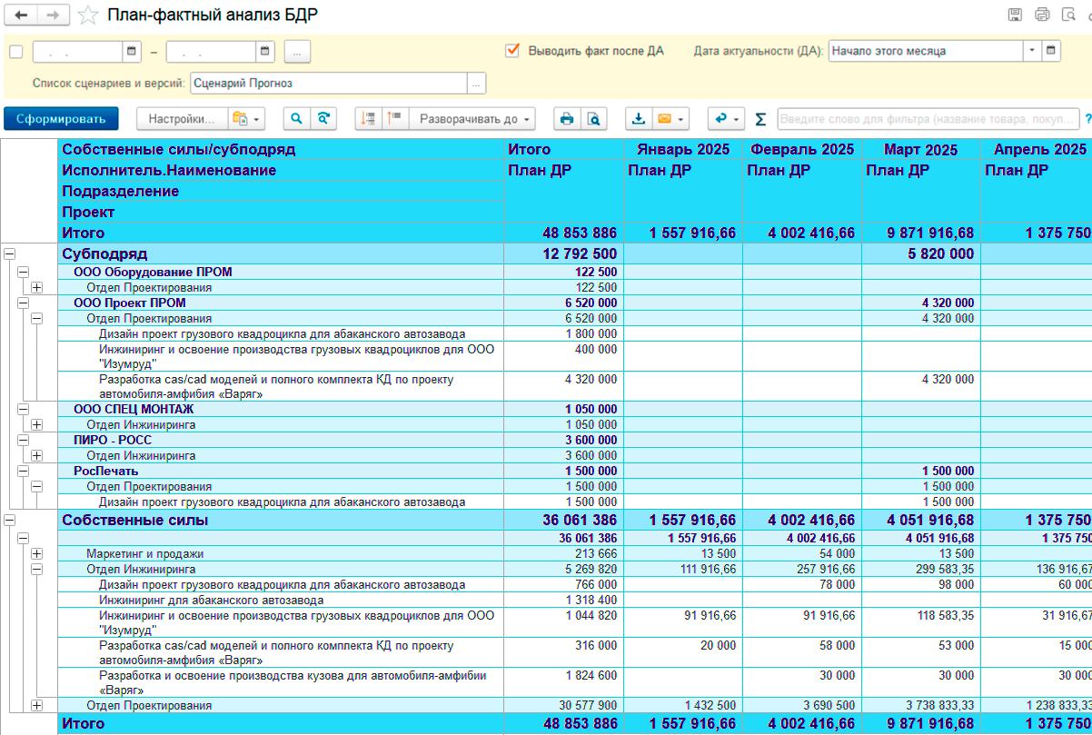 Управление работой подразделений также позволяет планировать и анализировать финансовые показатели работы подразделения, в том числе с разделением на работы, выполняемые субподрядными организациями и собственными силами (подразделениями).